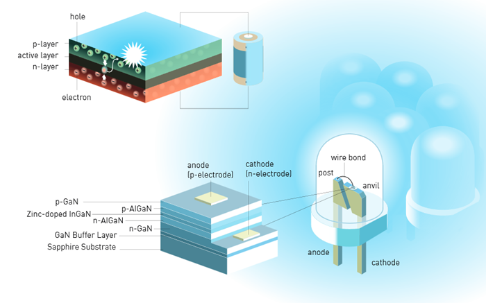 蓝色LED这项革命性的发明集齐了红、绿、蓝三原色的LED灯光,由此打开了自由表现色彩的大门,室外的大屏幕显示器及信号灯相继问世。将蓝色LED与黄色荧光物质结合制成的白色LED使人类可以使用一种全新的手段产生白色光源,并且更加持久和高效,为照明领域的发展带来了根本性转变。