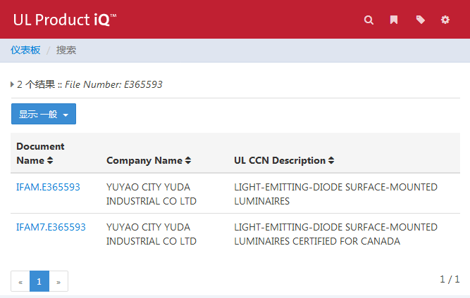 3. 稍后,显示两个搜索结果,其中“YUYAO CITY YUDA INDUSTRIAL CO LTD”即为制造商名称,点击相应的档案号码,可查询详细的产品型号、公司信息等资料。