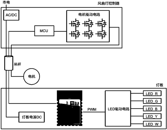 控制器引出两条电源线(VCC、GND)经吊杆下行至灯板,另有3条电机线(U、V、W)经吊杆下行至DC电机。