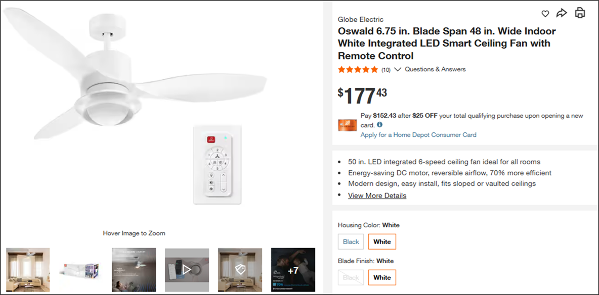 Globe Electric 智能吊扇灯在外观设计上造型简洁、线条利落,凸显动感与活力,能够满足年轻消费者与儿童细分市场的审美偏好,其视觉表现力与场景亲和性对注重个性表达和趣味性的用户群体表现出色。