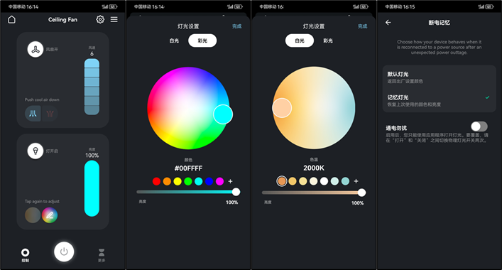Designers Fountain 智能吊扇灯将Wi‑Fi & Bluetooth 通信模块直接集成于灯板,借助灯板的开放空间优化信号收发路径,再配合蓝牙遥控器的直连控制技术,省去了传统方案的两根接收天线,既保证了通信可靠性,又便于现场安装,体现出较为创新的设计思路。其遥控器设计亦别具一格,多按键布局覆盖了APP端的所有控制选项,支持无配网场景下的全功能本地操作,兼顾不同用户的使用习惯,提升了操作便捷性与场景适配性。