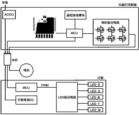 控制器引出两条电源线(VCC、GND)和1条灯光信号线(TX),经吊杆下行至灯板,另有3条电机线(U、V、W)经吊杆下行至DC电机。