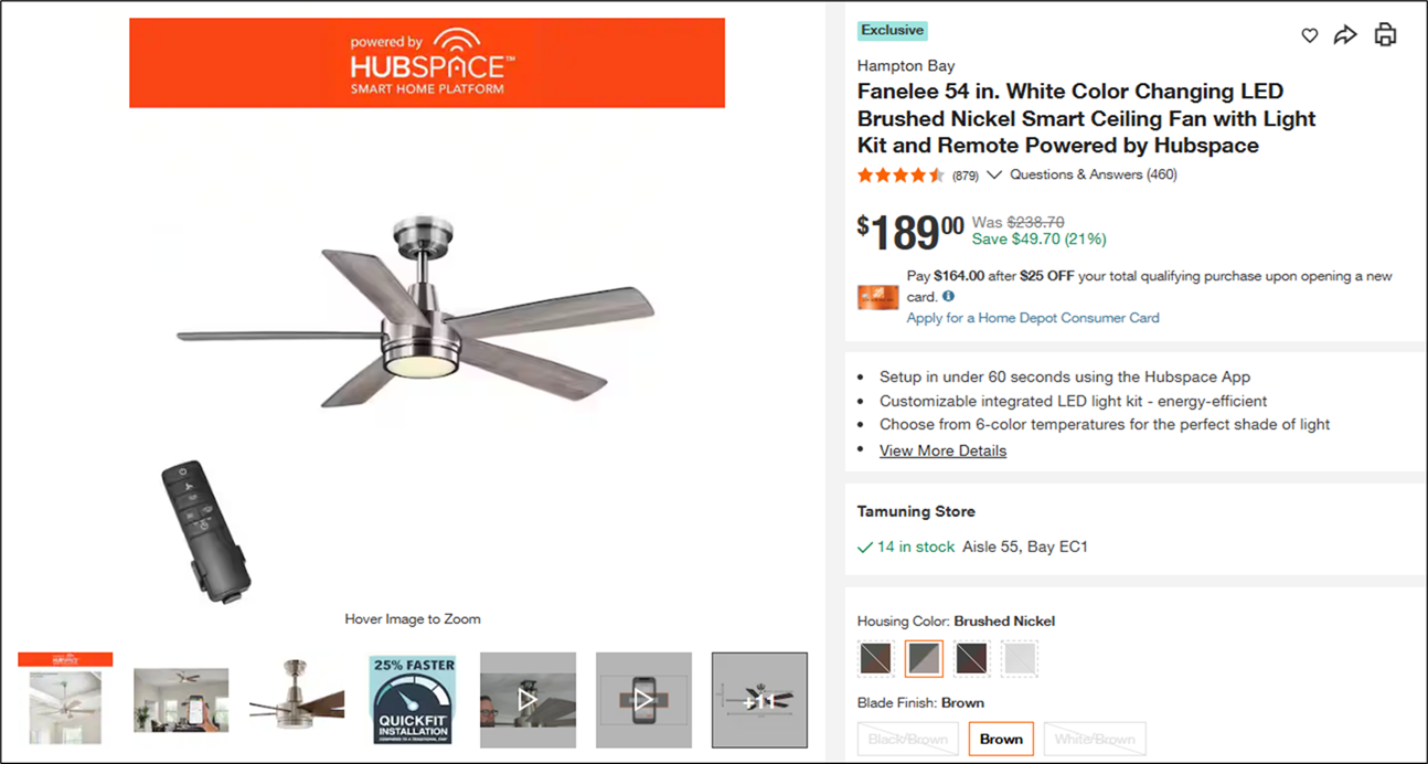HUBspace是Home Depot自营的智能家居品牌,产品覆盖照明、风扇、电工、门锁、传感器等多个类别,旨在为消费者打造一站式的智能家居解决方案,以便实现语音控制和自动化管理,从而大幅提升用户体验,其吊扇灯的主要代工厂位于中国福建省和广东省。官方网站是:https://www.homedepot.com