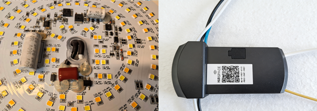 灯板上的可控硅调光驱动电路根据导通角大小调节输出电流,进而控制LED亮度。掉电检测电路从电源线中提取出正弦波中断时间后,根据约定逻辑输出相应比例的两路PWM信号,驱动两个斩波开关,从而调节两路LED灯串的电流比例,通过亮度混合实现色温调节。例如正弦波中断2个周期代表2700K、中断10个周期代表3500K、中断22个周期代表6500K等等。