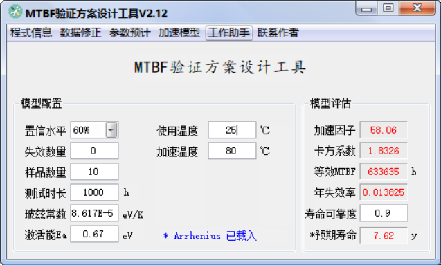 MTBF验证方案设计工具 V2.12 为免安装绿色软件,使用前请确保主程序与配置文件位于同一文件夹,双击“MTBF验证方案设计工具V2.12”即可启动。软件界面简洁,顶部为菜单栏,左侧为模型配置区,右侧为模型评估区。