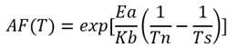 Arrhenius 模型用于描述失效机理主要由温度引起的热加速,是可靠性领域最典型、应用最广泛的加速模型。对于 LED 驱动器,通常采用高温老化法验证可靠性,因此可选择Arrhenius模型进行计算。其温度加速因子表达式为: