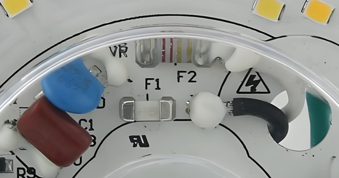 当线性恒流电路失效后,灯板进入持续大功率异常工作状态,保险电阻因过载而发热。由于过流值未能使其快速熔断,且其产生的热量通过铝基板持续散发,导致保险电阻的热积累时间进一步延长。此时,大部分电能转化为热能,使铝基板温度迅速攀升并维持高温,从而引发一系列连锁反应:如聚碳酸酯(PC)灯罩(通常耐温≤120℃)软化变形、导线绝缘层熔融,最终导致内部线路烧毁,极端情况下可能诱发火灾。这个过程并非瞬时发生,而是有充分的酝酿期,这正是其潜在危险所在。
